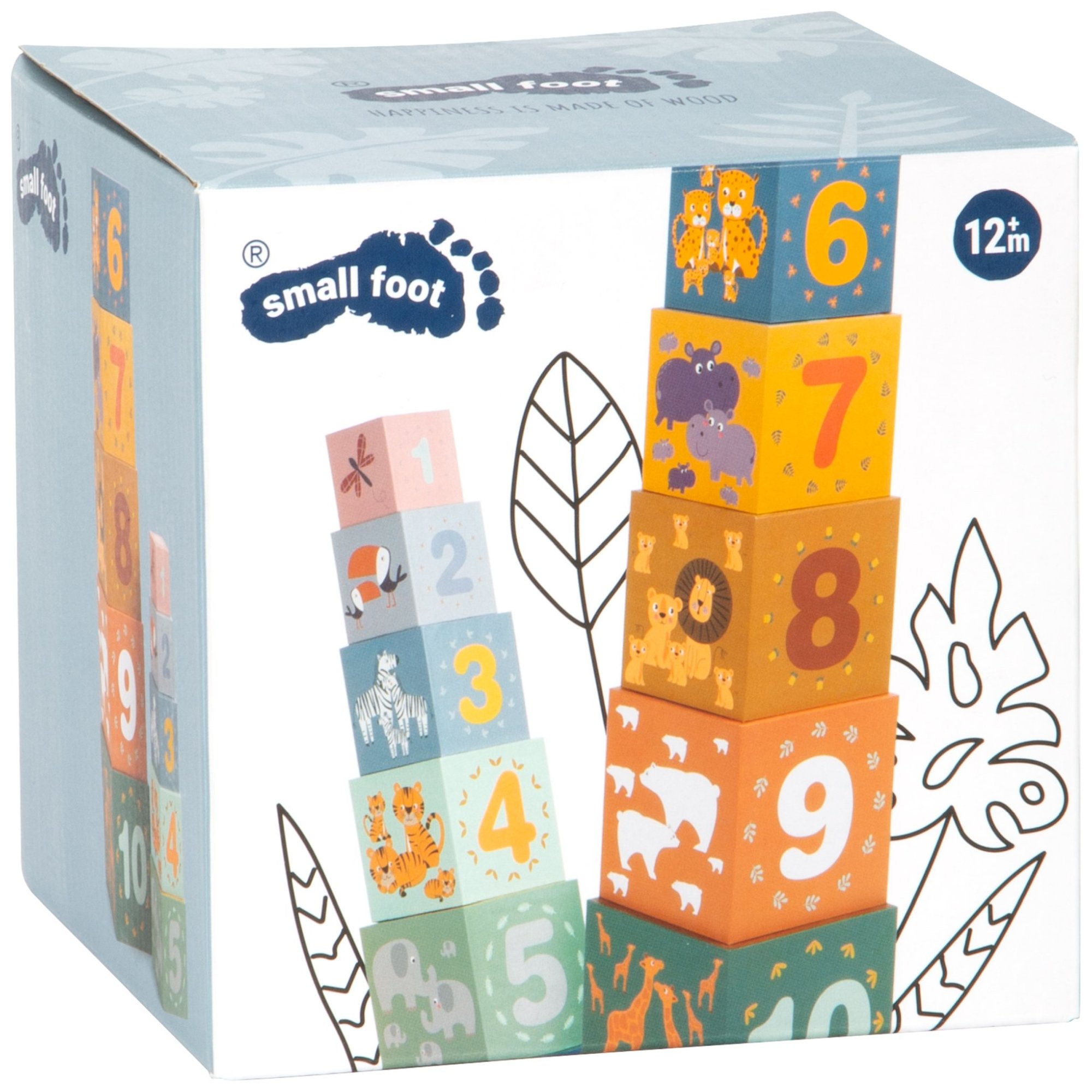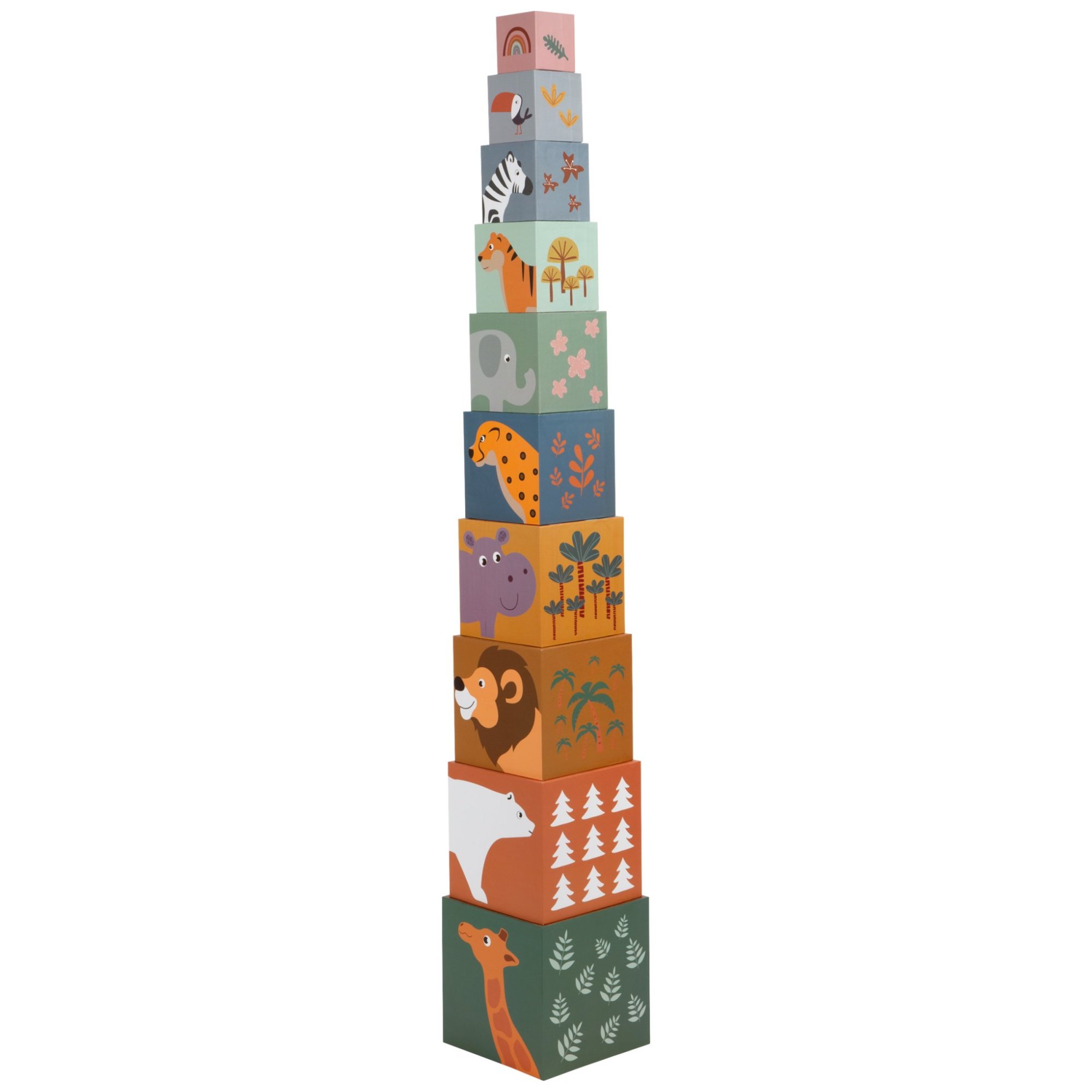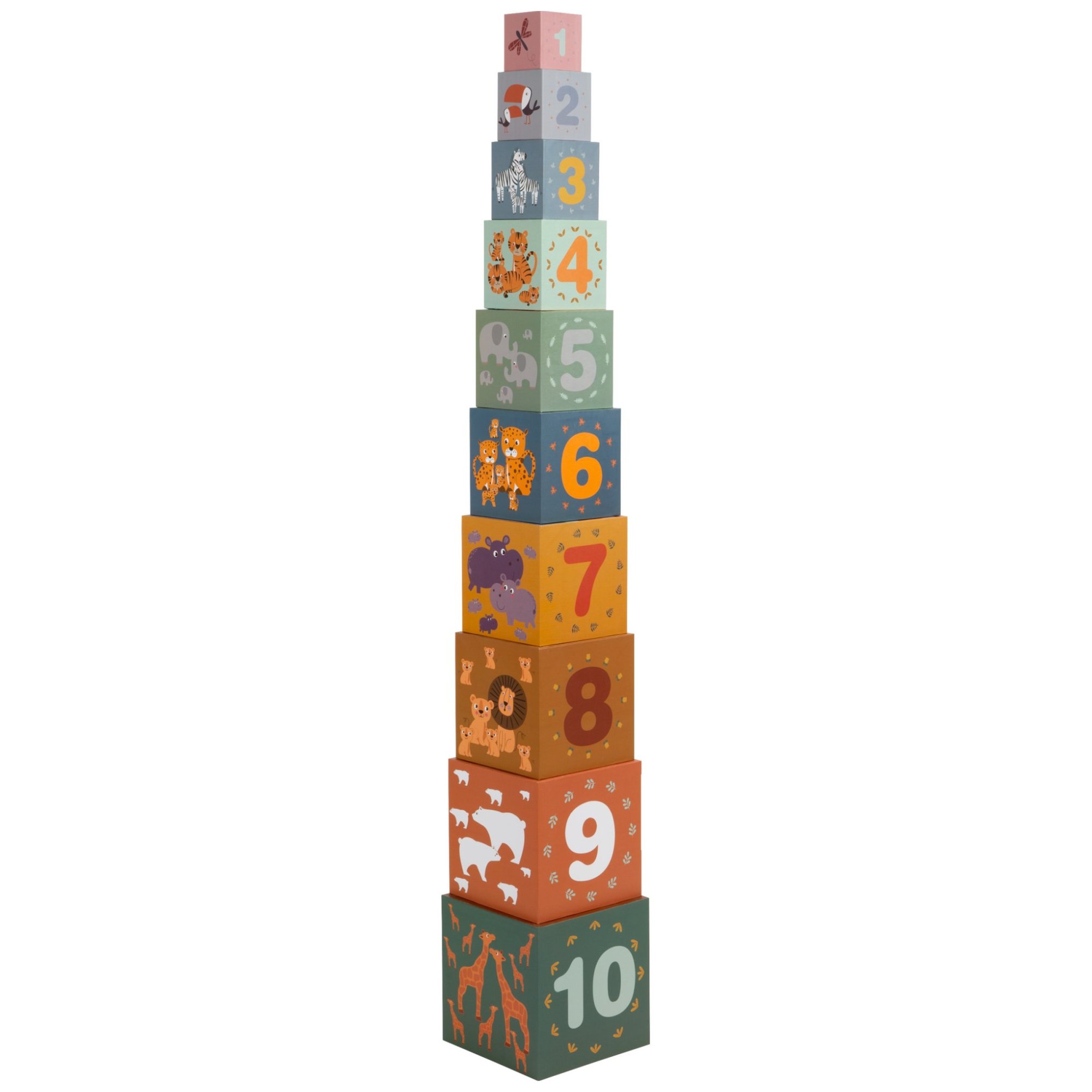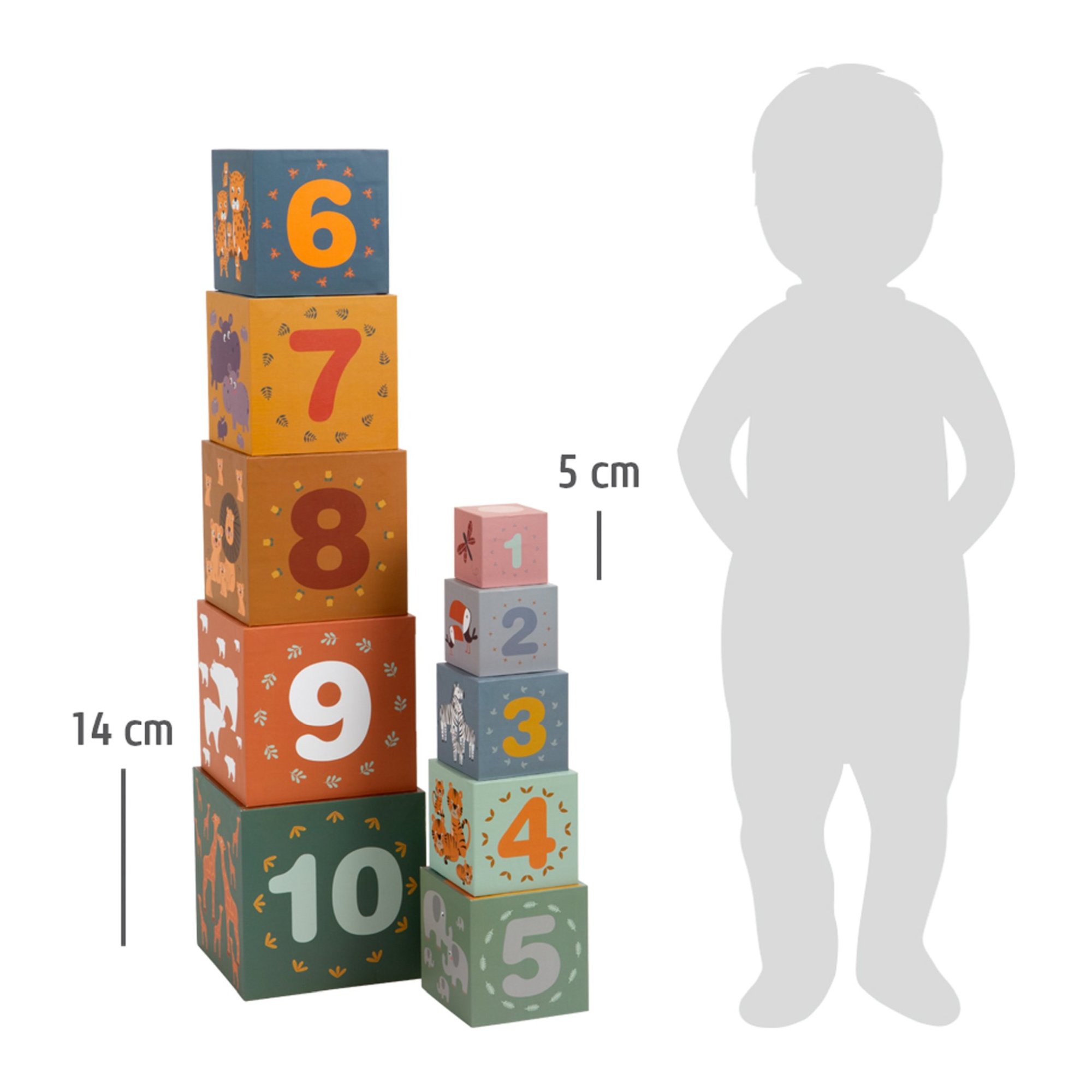 Tierischer Stapel-Spaß! Mit diesen zehn Stapelwürfeln in modernem, kindgerechtem Safari-Look können kleine Baumeister ihre Stapel-Künste unter Beweis stellen. Die Stapelwürfel aus stabiler Pappe sind mit niedlichen Motiven aus der Tierwelt sowie mit den Zahlen von 1-10 versehen. Die Anzahl der abgebildeten Tiere auf einem Würfel entspricht dabei der Zahl auf der Würfelrückseite. So entwickeln Kinder spielerisch ein erstes Zahlenverständnis und lernen verschiedene Tiere kennen. Wer bringt die Würfel in die richtige Reihenfolge? Beim Sortieren und Stapeln der Safari-Würfel trainieren die Kleinen Motorik, Konzentration und Geschicklichkeit, während sie gleichzeitig ein Verständnis für Farben und Größen entwickeln. Nach dem Spielen lassen sich die Würfel ganz einfach ineinander stecken und platzsparend im größten Würfel verstauen.