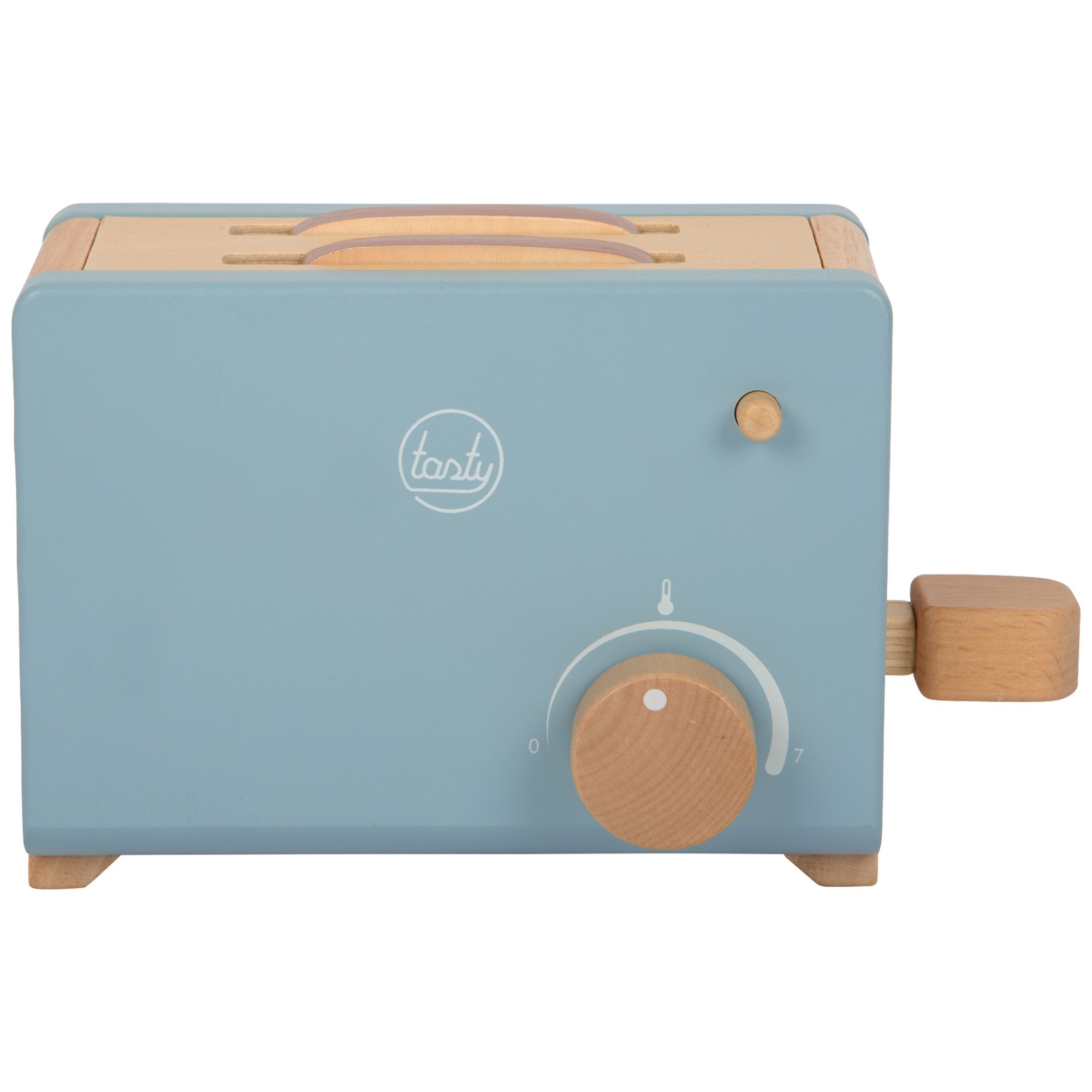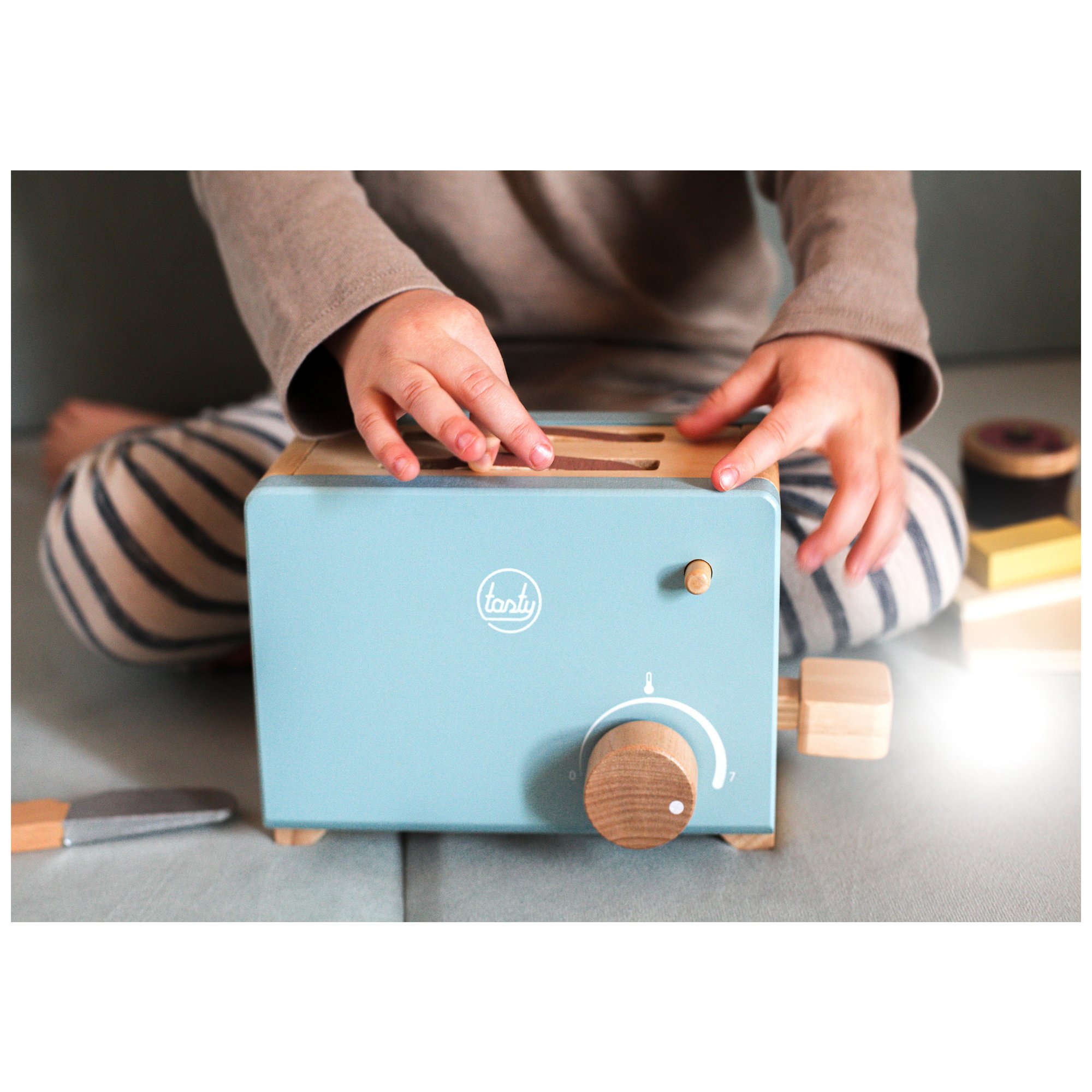 Der Toaster-Set „tasty“ von small foot bringt realistischen Spielspaß in jede Kinderküche. Aus robustem Holz gefertigt, besticht der Toaster durch eine ansprechende Farbgestaltung in Rauchblau und Weiß sowie natürlichen Holzelementen. Mit seiner Pop-Up-Funktion und dem Drehknopf mit Geräusch verfügt das Set über eine authentische Spielmechanik. Es enthält alles, was kleine Küchenchefs für ein gelungenes Frühstück benötigen: zwei Toastscheiben, ein Messer, ein Brettchen, Butter und Marmelade. Die praktische Aussparung ermöglicht das Aufhängen des Brettchens, während die feinen Details das Spielvergnügen bereichern.
