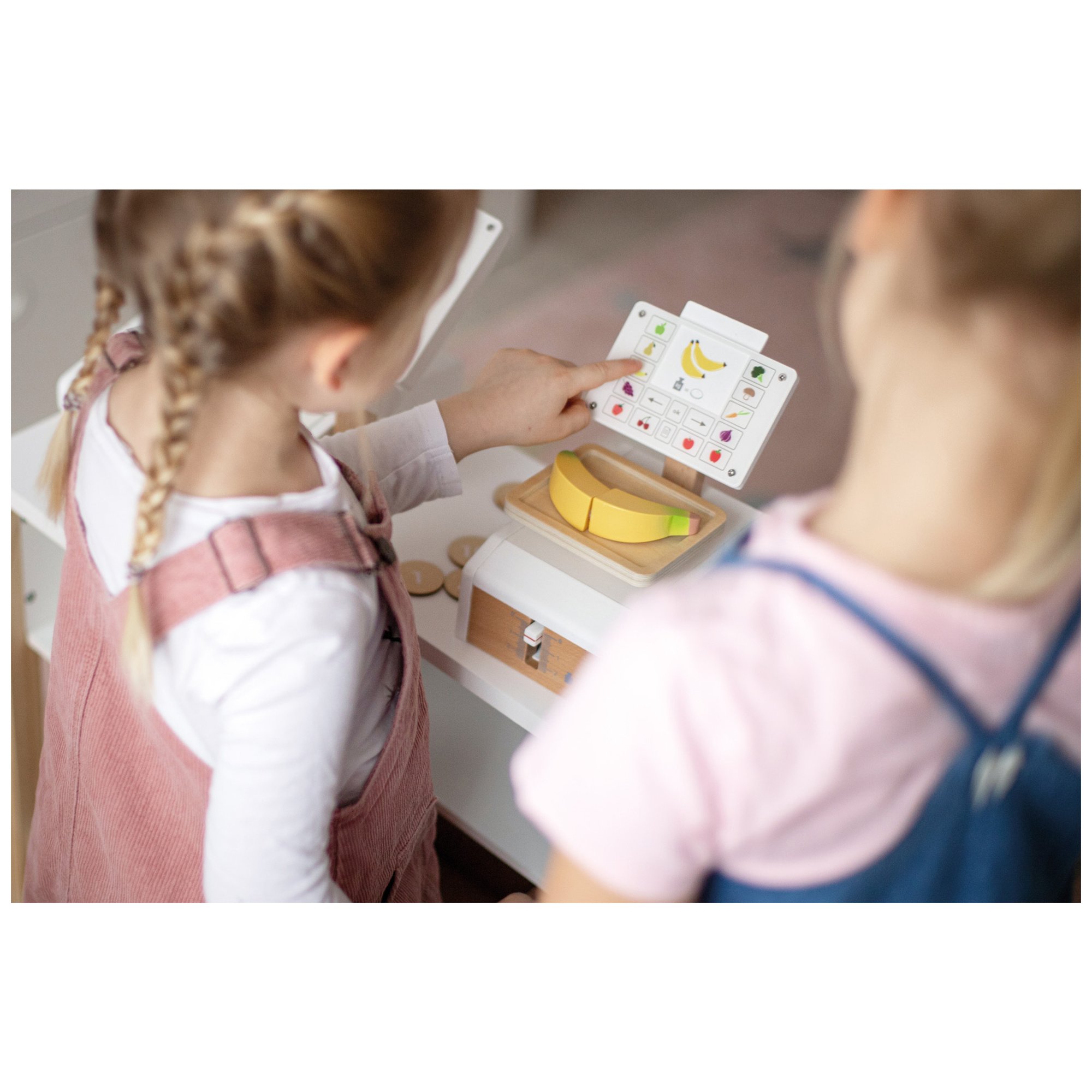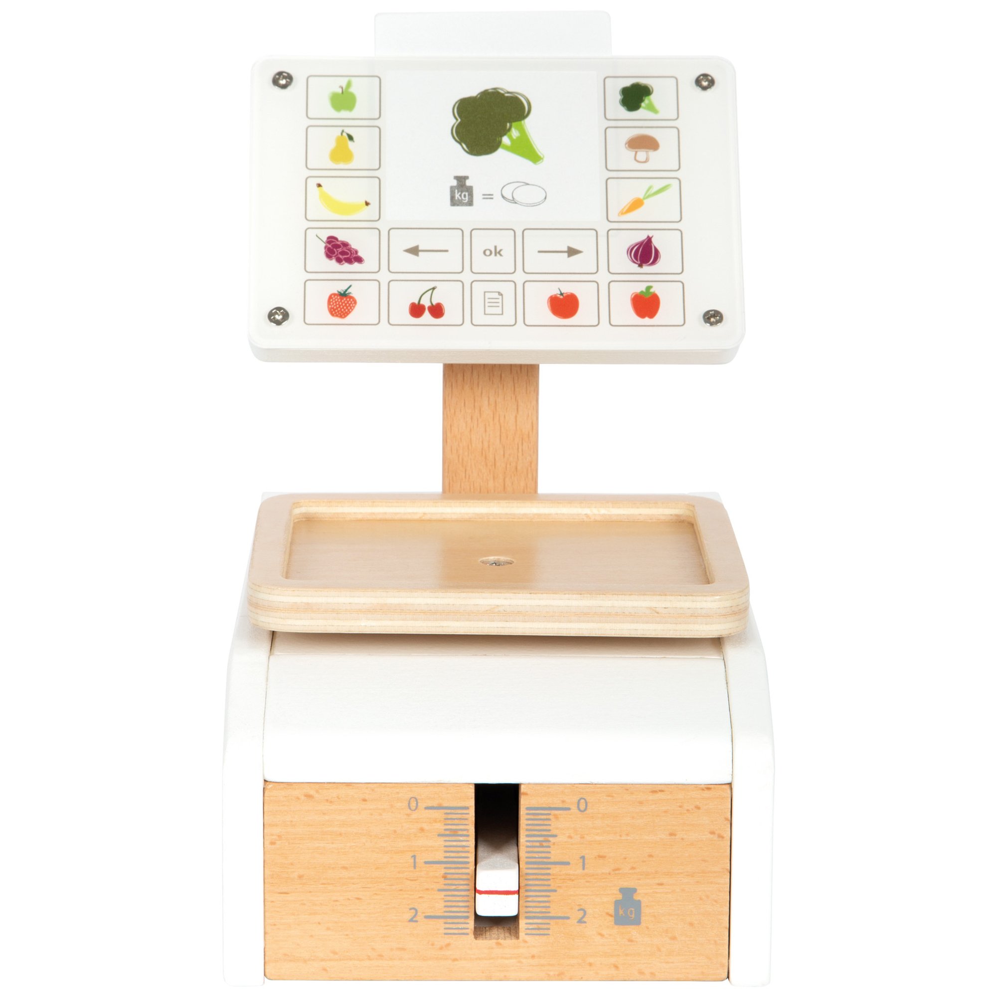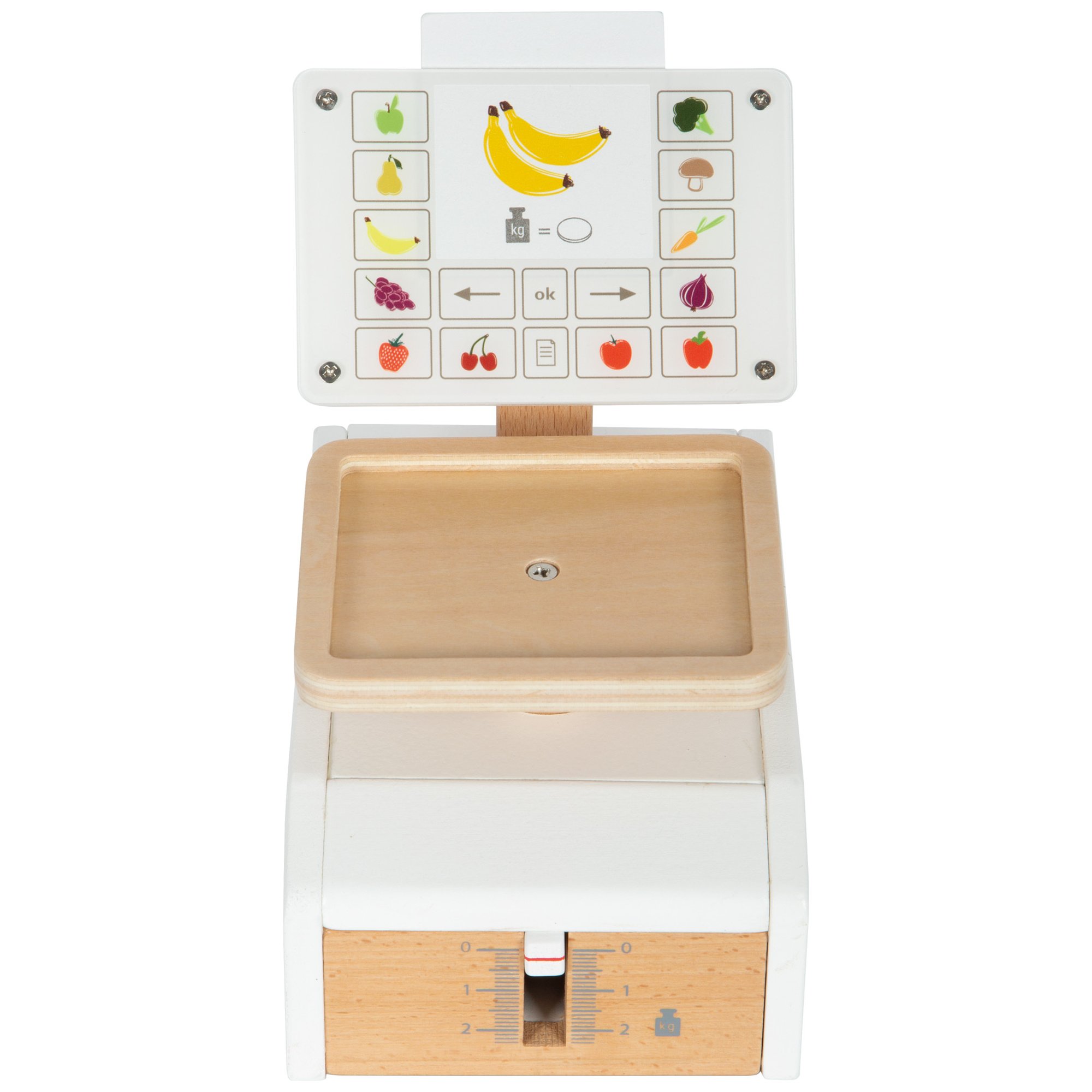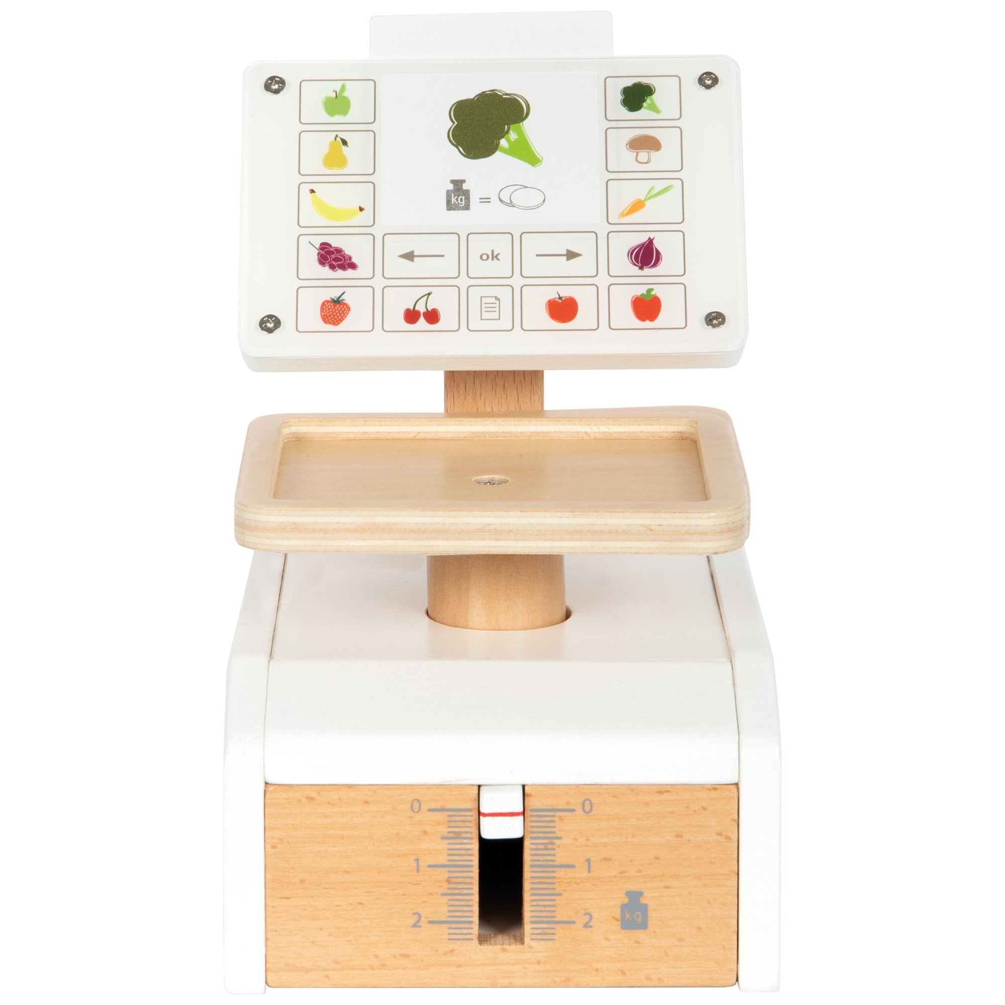 Die kleine Holzwaage "fresh" von small foot ist das ideale Spielzeug für jeden Kaufladen oder die Kinderküche. Mit einer großen Wiegefläche und einem realistischen Federmechanismus bietet sie ein authentisches Spielerlebnis. Der bewegliche Zeiger und die abwechselnd in die Waagschale gelegten Objekte bringen spielerische Freude ins Wiegen. Der große Monitor mit Acrylglasscheibe ist mit Gemüse- und Obstdarstellungen versehen, während sechs beidseitig bedruckte Produktkarten mit Abbildungen von Lebensmitteln die Waage ergänzen. Diese Spielwaage fördert nicht nur den Umgang mit Gewichten, sondern vermittelt Kindern auch ein Gefühl für Preise durch die Darstellung von Münzen auf den Karten. Das hochwertige Material aus Holz und Acrylglas sorgt für Langlebigkeit und macht die Waage zu einem echten Blickfang im Kinderzimmer.