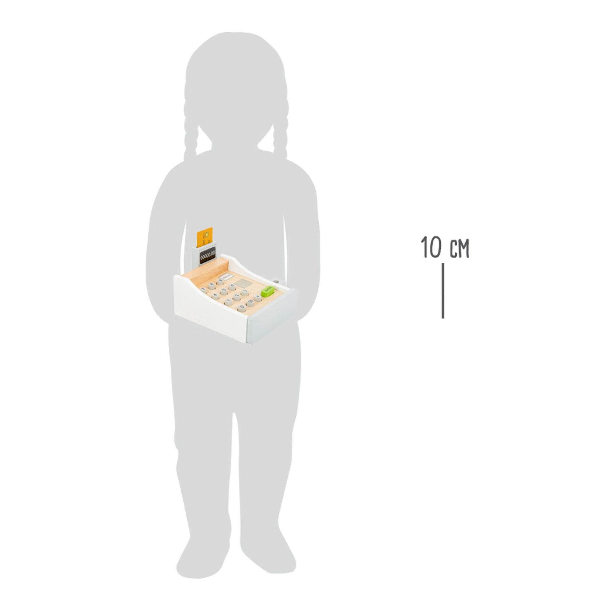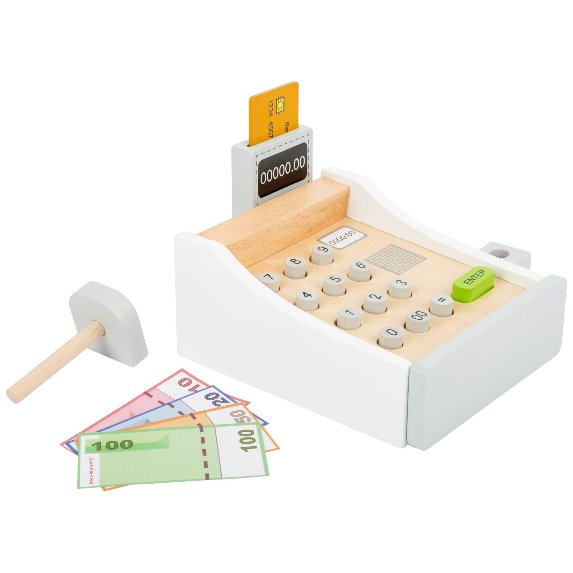 Es klingelt in der Kasse! Diese schöne Holzkasse darf in einem gut sortierten Kaufmannsladen auf keinen Fall fehlen. Das spielerische Kassieren trainiert den Umgang mit Geldbeträgen und Preisen. Das beigefügte Spiel- und Rechengeld und die Kreditkarten aus Holz finden Platz in der herausziehbaren Kassenschublade. Der Preis für gekaufte Waren kann sogleich über die Tastatur eingegeben werden. Wer ist der Nächste in der Reihe?